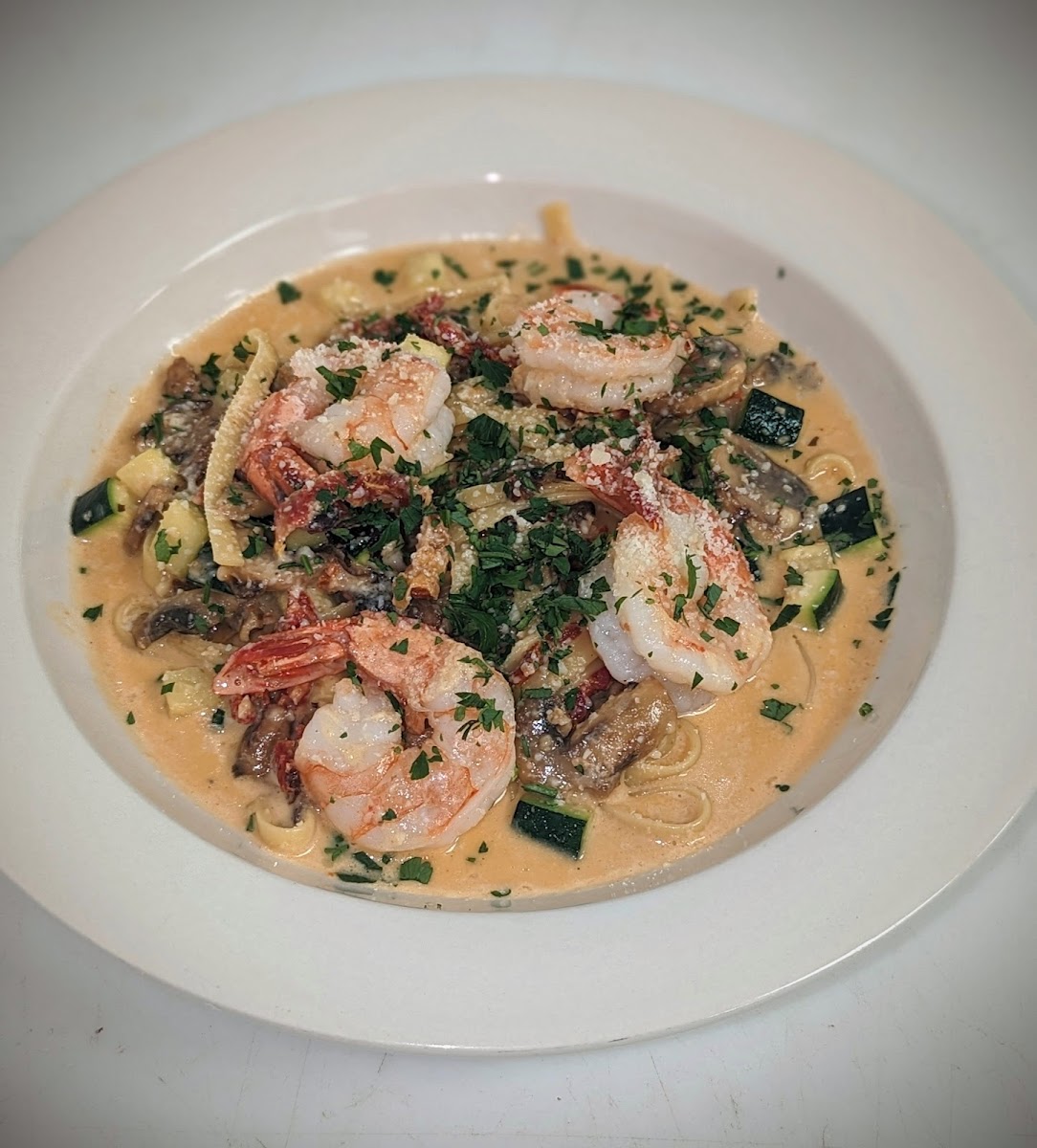 The service and food was great, Jim did a fine job making suggestions & taking care of us. We ordered two 12 inch pizzas, (Mel-iterrian & Den’s Delight) 2/$28 special on Tuesdays. It came with a side salad or cup of soup. The tiramisu is delicious and a fair price at $8 for a large portion to share. We will return.