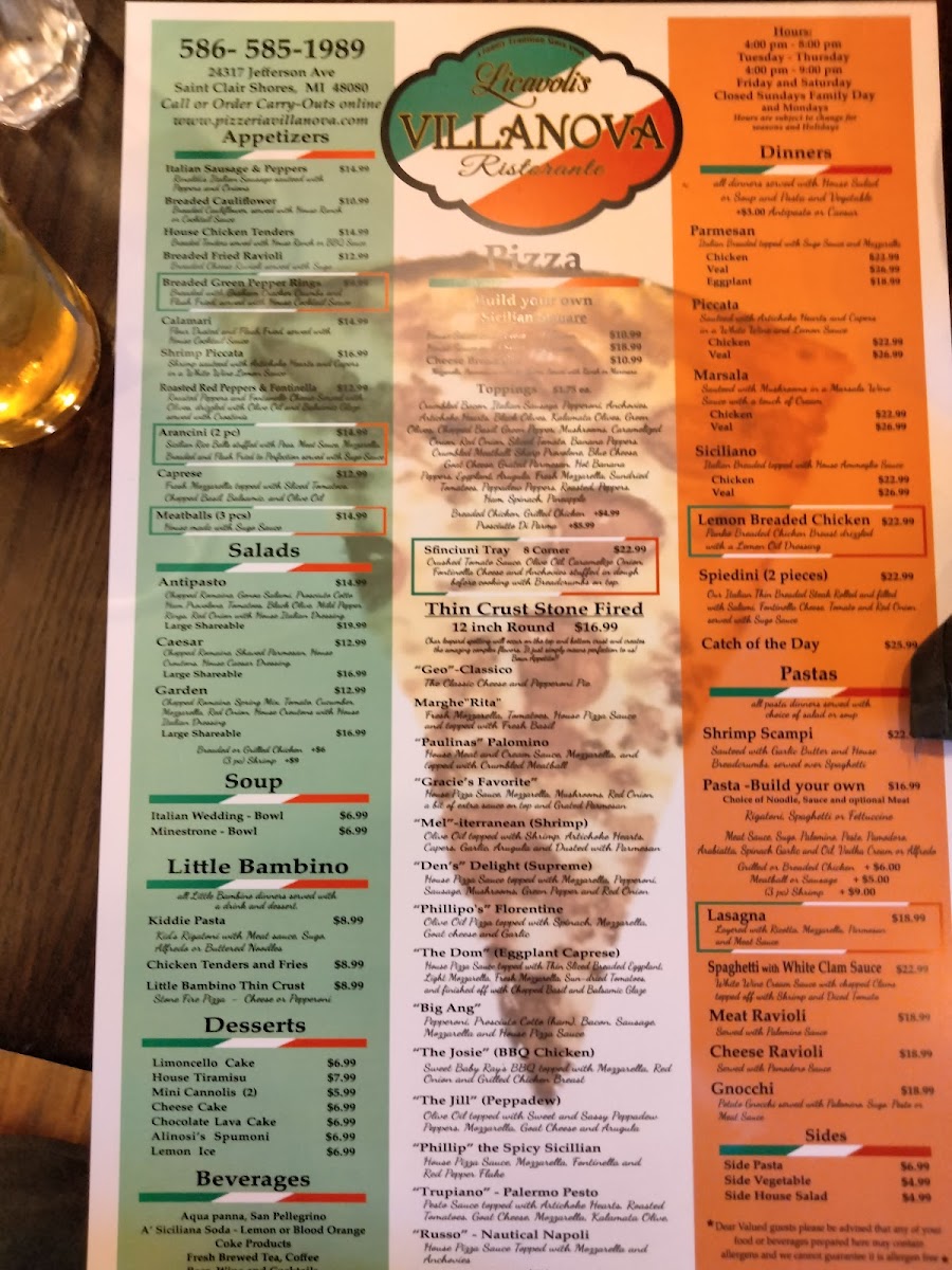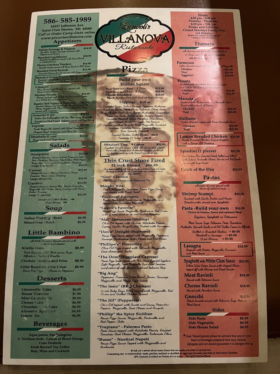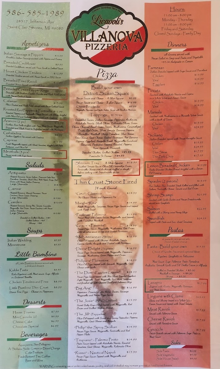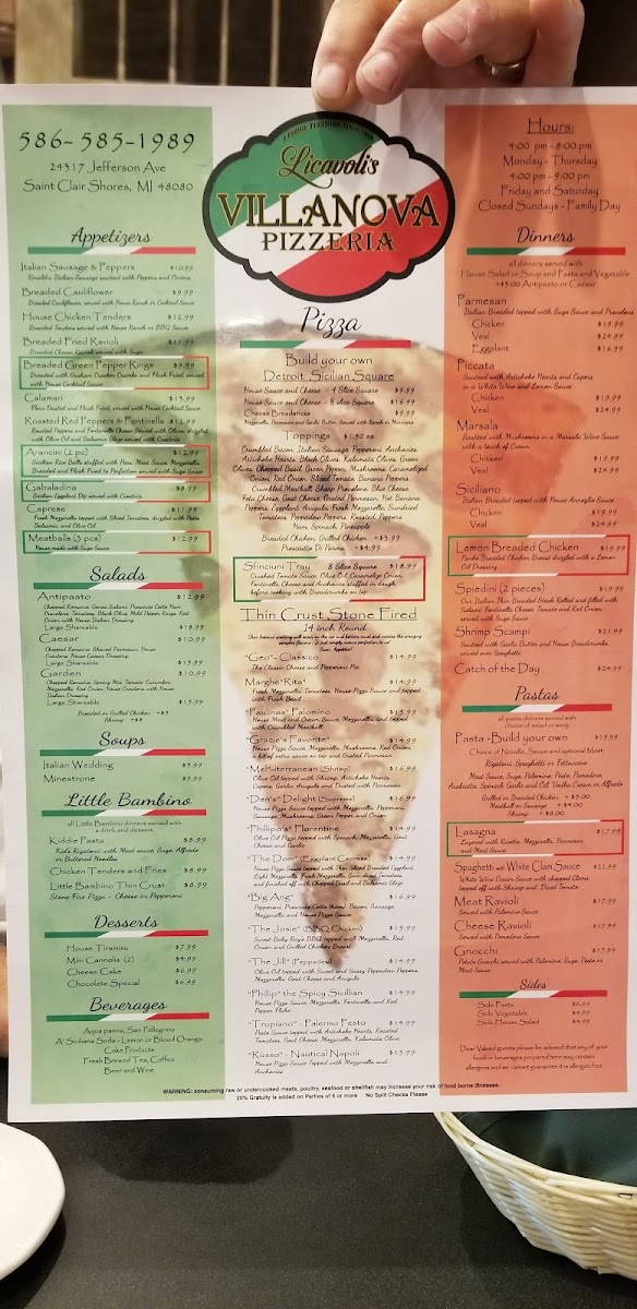 Licavoli's VILLANOVA PIZZERIA & RISTORANTE Menu